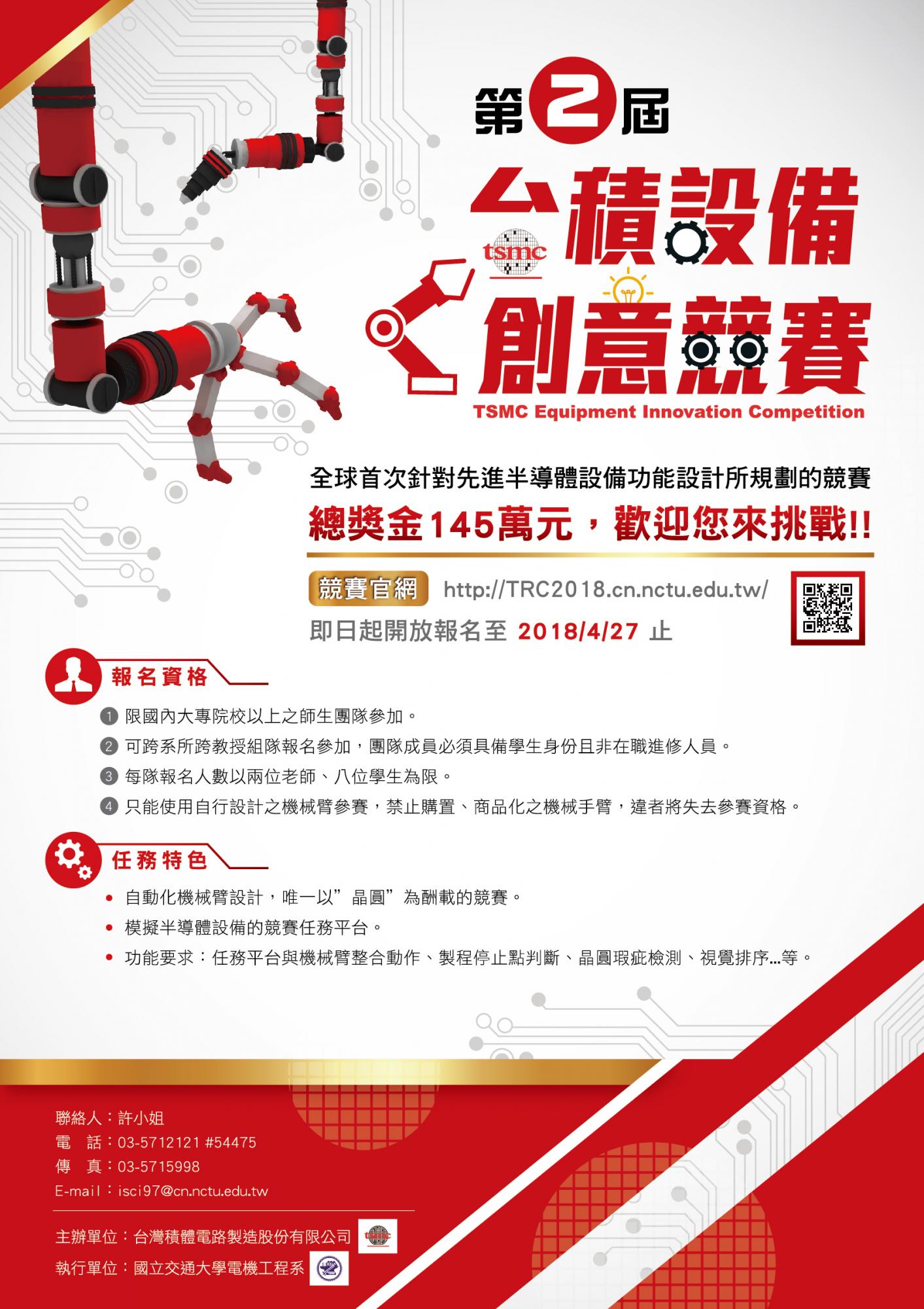 2018 第二屆台積設備創意競賽(報名時間至4/27截止) [四技大學部] 2018-03-15 AdminAdmin 競賽官網 : http://trc2018.cn.nctu.edu.tw/ 報名時間 : 即日起開放報名至2018年04月27日止 相關資訊請至競賽官網查詢 聯絡人:許小姐 電話:03 571 2121 #54475 Email:isci97@cn.nctu.edu.tw 主辦單位:台灣積體電路製造股份有限公司 執行單位:國立交通大學 電機工程系 海報1-0312
