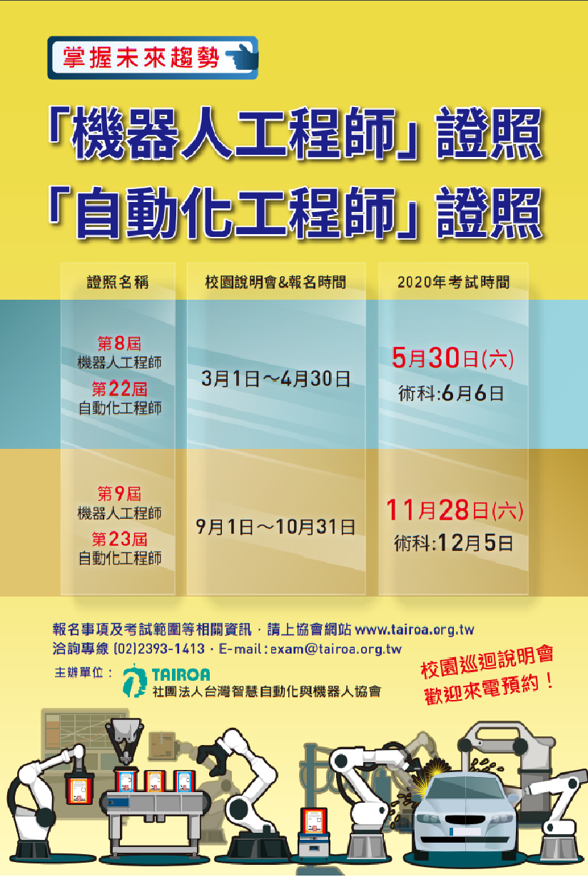 二、台灣智慧自動化與機器人協會將於本校舉辦考試說明會, 訂3/24(星期二)下午2點至3點於資訊大樓1樓 AIA0104 階梯教室舉辦,敬邀學生及老師帶班參加。
