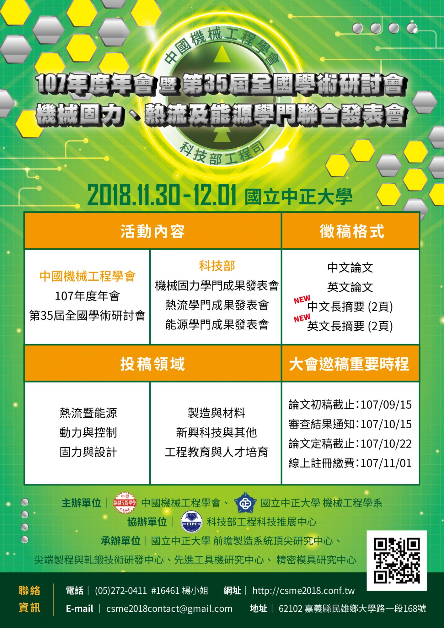 中正大學辦理「中國機械工程學會CSME 107年度年會及第 35屆全國學術研討會暨科技部機械固力、熱流與能源學門 聯合成果發表會」 [本系] 2018-08-01 AdminAdmin 「中國機械工程學會CSME 107年度年會及第 35屆全國學術研討會暨科技部機械固力、熱流與能源學門 聯合成果發表會」