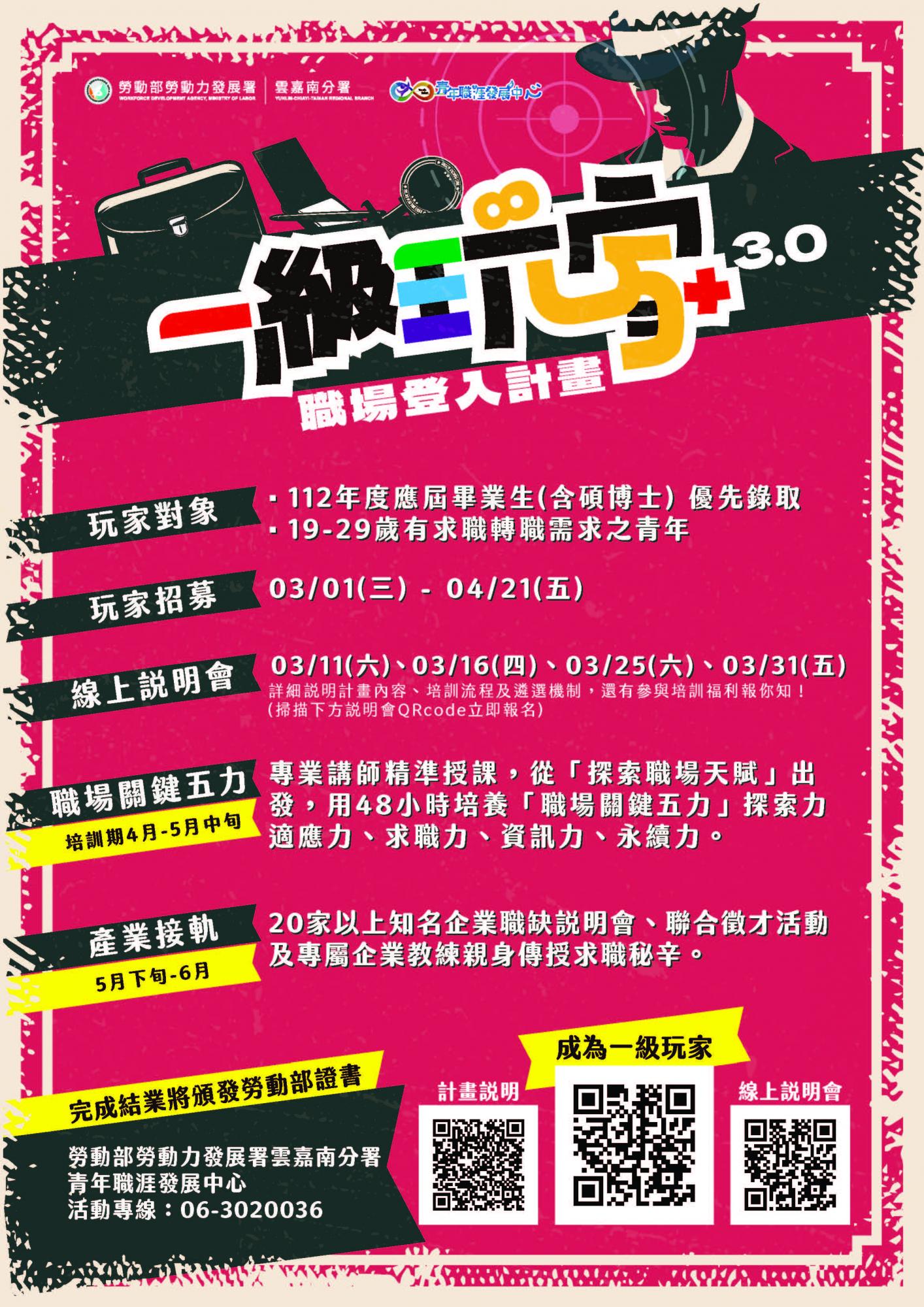 勞動部青年職涯發展中心【 一級玩家3.0:職場登入計畫】求職即戰力培訓計畫