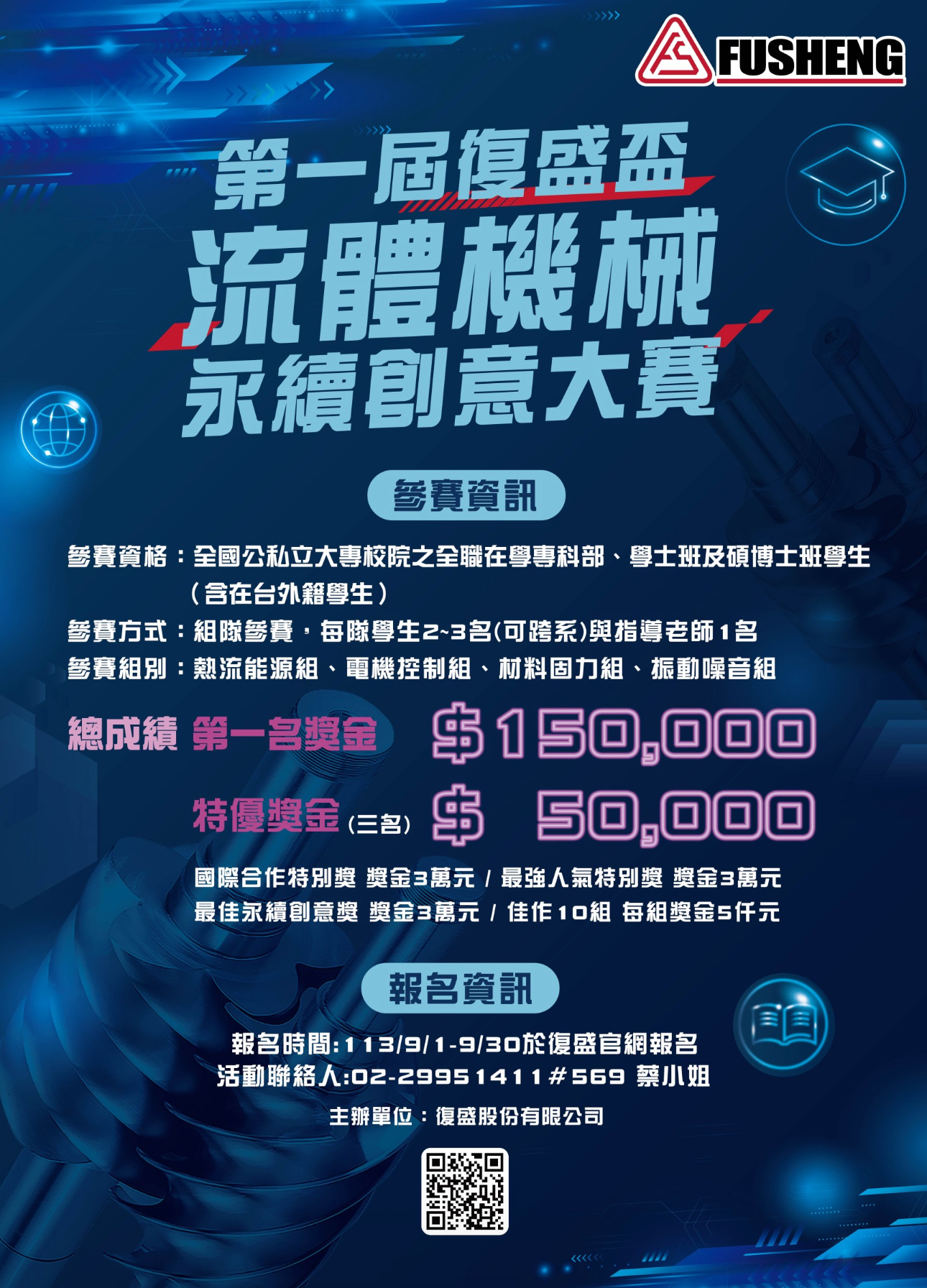 復盛盃流體機械永續創意大賽 [本系] 2024-06-26 AdminAdmin 復盛集團是台灣深耕70年的企業,如今已經拓展全球多個據點,壓縮機更於台灣市占率多達六成,從壓縮機起家,到眾所皆知的高爾夫球頭甚至是IC導線架,都是復盛持續精進的成績。此次活動想邀請虎尾科大一同推廣與參與流體機械永續創意大賽,目前將此次活動海報電子檔供協助轉貼各系辦與院辦,也誠摯地邀請虎尾科大專院校各單位教授一同共襄盛舉此次競賽,由衷感謝。 流體機械永續創意大賽A2海報_全國
