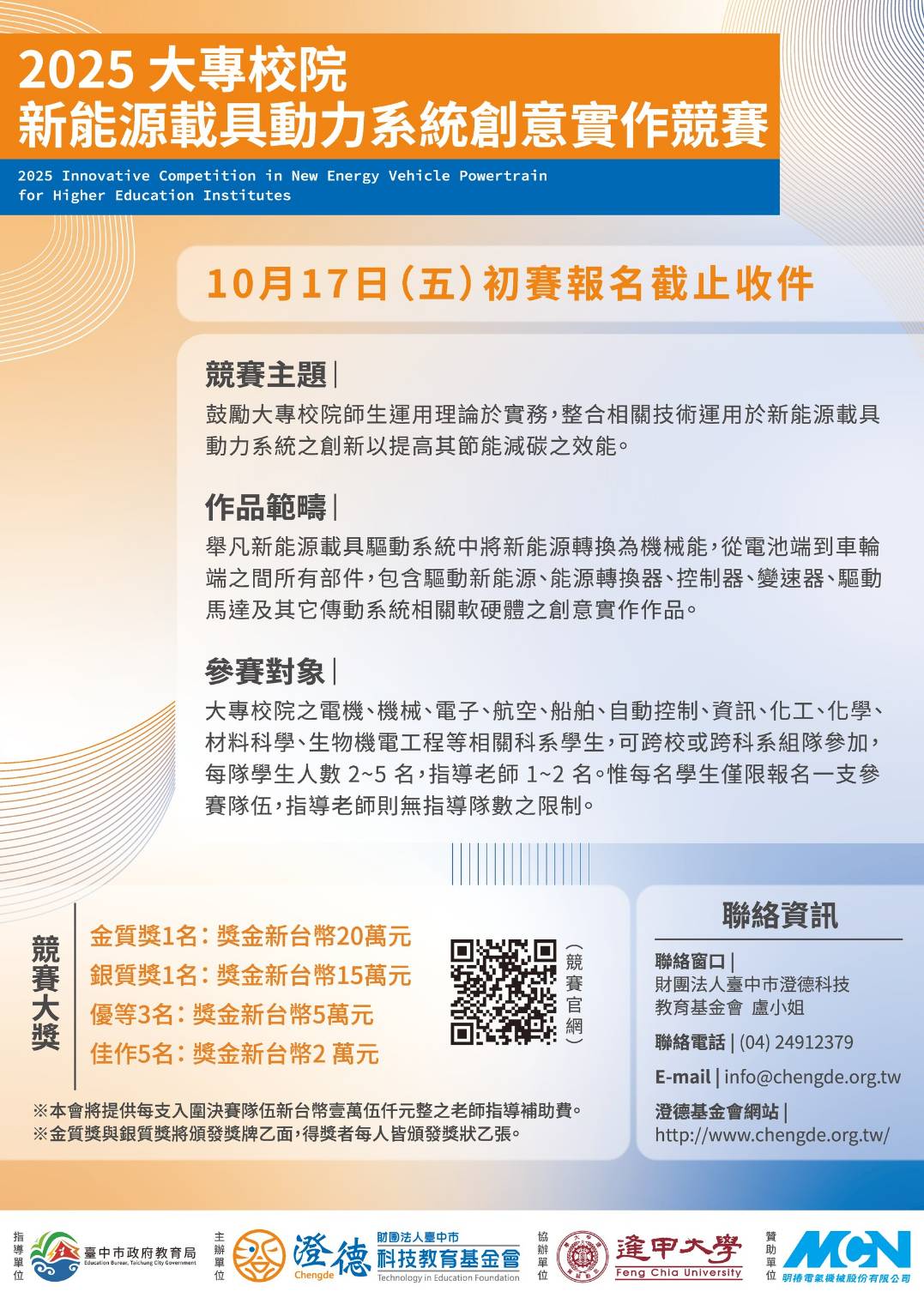 澄德基金會-2025創意實作競賽開始報名 [本系] 2025-09-04 AdminAdmin 「2025大專校院新能源載具動力系統創意實作競賽」已經開始報名囉! 詳情可至本會官網:https://www.chengde.org.tw/ 「創意實作競賽-參賽辦法」查看。 附件