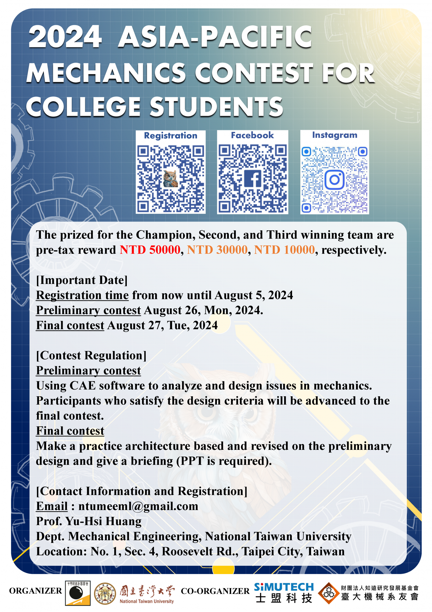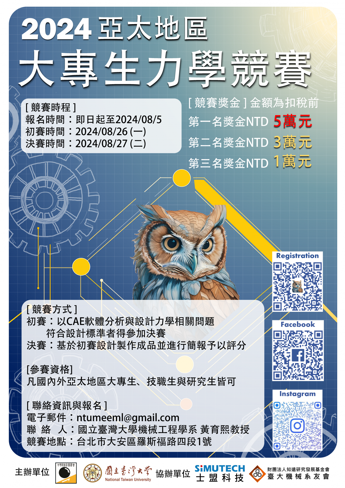 2024亞太地區大專生力學競賽宣傳 [本系] 2024-06-12 AdminAdmin 中華民國力學學會於2024年舉辦的亞太大專生力學競賽,今年由臺大機械主辦,誠摯邀請貴院系鼓勵學生參與競賽,大專生與研究生皆符合參賽資格唷。 主辦單位:中華民國力學學會、國立臺灣大學機械系 協辦單位:士盟科技、臺大機械系系友會暨知遠基金會 A2中文海報 A2英文海報